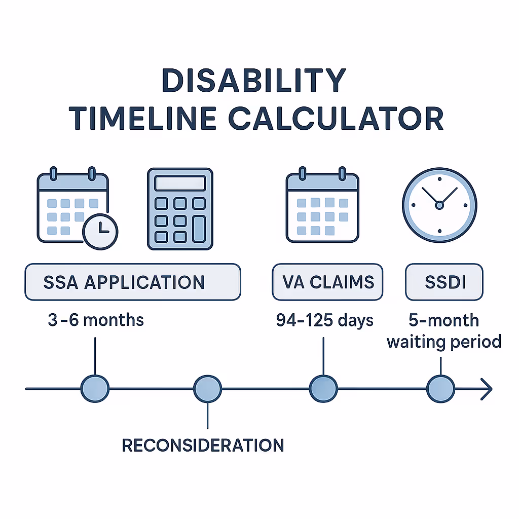 The application process varies. SSA initial disability applications take 3–6 months, while appeals can extend timelines a year or longer. VA claims average 94–125 days, though board appeals may exceed 500 days. The five-month waiting period applies before SSDI pays benefits. Filing early and checking your application status through SSA’s services or your VA account helps reduce delays.